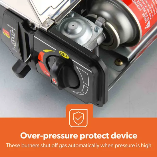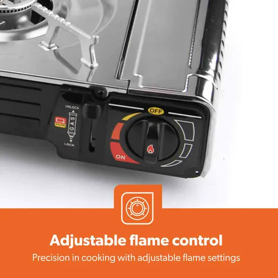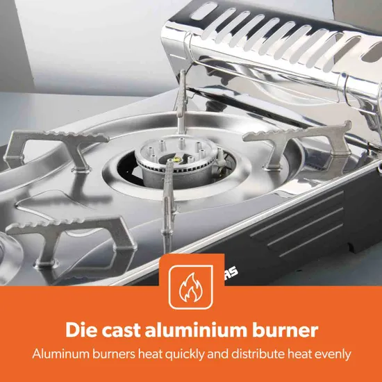 This portable camping gas stove is a compact and efficient cooking solution designed for outdoor activities such as camping trips, festivals, picnics, beach outings, and garden cooking. Featuring a powerful single-burner design, this lightweight and cordless stove is easy to transport and store, making it an ideal companion for outdoor adventures. The stove includes durable enamelled pan supports that provide excellent stability for pots and pans while also making cleaning simple and convenient. Equipped with an automatic ignition system, the stove allows quick and effortless lighting without the need for matches, while the adjustable flame control knob enables precise temperature regulation for different cooking needs such as boiling, simmering, or frying. For added safety, the stove features a secure locking mechanism that ensures the gas canister is correctly installed and firmly attached during use. Built from high-quality metal materials, this portable stove is designed to withstand outdoor conditions and repeated use, ensuring long-lasting durability. Finished in silver, the stove measures H:62.0 × W:11.5 × D:28.0 cm, weighs 2.7 kg, and comes with a 2-year manufacturer guarantee. Model Number: GGC31042UK.
