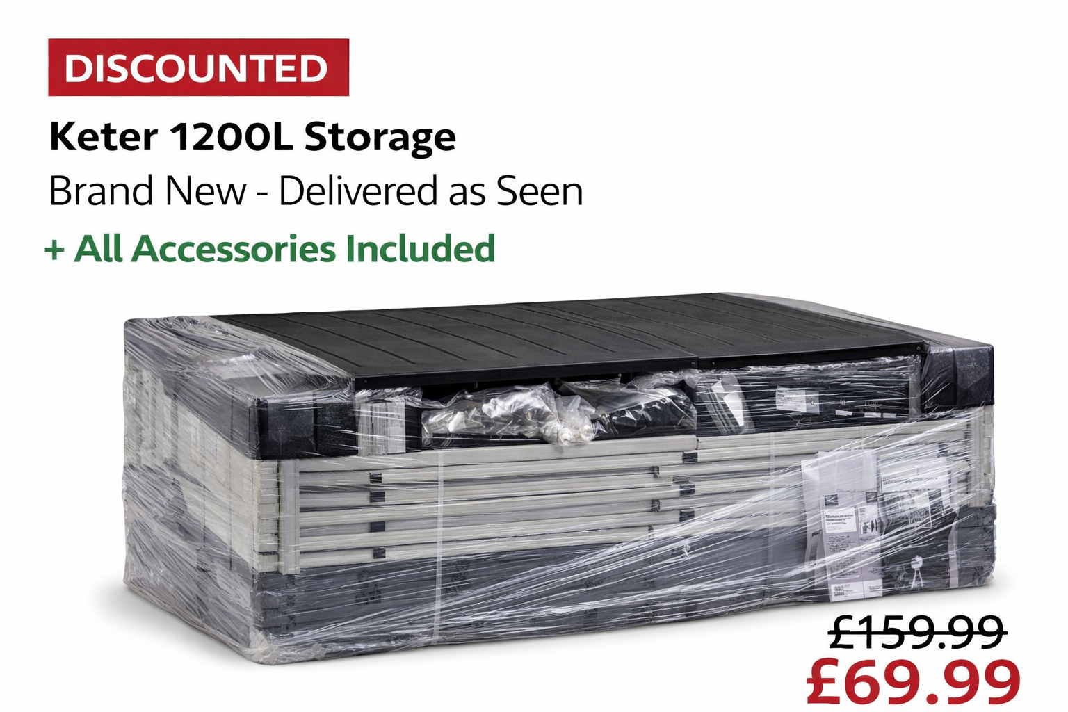 Ordered the 1200L Keter storage box from Homiva and it arrived a few days later than expected. Easy to assemble and feels very robust. Plenty of space and completely weatherproof. Would definitely recommend.
